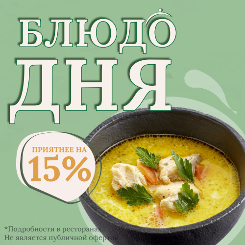 В меню разнообразные виды блинов со сладкими и сытными начинками по авторским рецептам, традиционные русские блюда: борщ, уха, пельмени, а также вкусные завтраки: сырники, каши и омлеты с начинками.