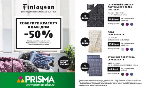 Акция в гипермаркете PRISMA: коллекция домашнего текстиля от финского бренда Finlayson со скидкой 50 %!